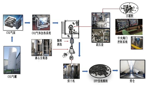 Epp材料生產所使用到的設備包括二氧化碳氣泵和氣罐、氣體加熱系統、高壓釜、離心分離器、中央控制系統、烘干機、筒倉等。大致的作用可看上圖。